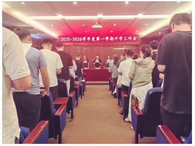 会上,副院长黄艾华带领全体教职工集体宣读并现场签订《师德师风承诺书》,以庄重仪式强化立德树人根本使命,筑牢师德师风建设防线;副院长袁安会通报了暑期“放假不放学”工作落实情况,通过具体的数据和案例,展示了暑期工作的成果与亮点,同时针对存在的不足提出优化方案,为新学期工作提供改进依据;副院长苏以全宣读了《关于做好2025-2026学年度第一学期开学前准备工作的通知》,详细部署了新学期员工队伍建设、老生缴费报考、教学计划、课程安排、师资调配、教学设施检查、学生心理普查等关键任务,为开学平稳运行奠定基础。