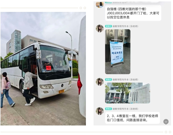 考试当天,送考老师提前抵达考点集合点,有序组织考生签到、核对信息,反复叮嘱考生仔细审题、规范答题、诚信应考。针对考点未设在本校的考生,各合作高职院校精心安排大巴车点对点接送,全程保障考生安全、准时抵达考场;考场外,我院专门为学生设立休息室,送考老师全程坚守岗位,为学生提供问题咨询、应急协助等贴心服务,及时协助考生解决忘带证件、走错考点等突发情况,用细致服务为考生筑牢应考保障线。